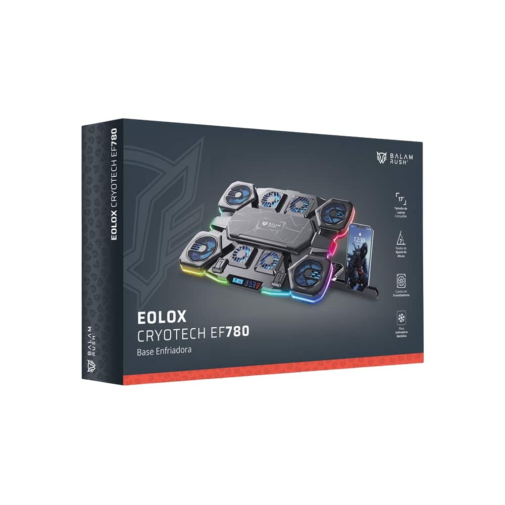 La Base Enfriadora Balam Rush Eolox Cryotech EF780 está diseñada para mantener tu laptop a temperaturas óptimas incluso bajo uso intensivo. Cuenta con 9 ventiladores estratégicamente distribuidos que mejoran el flujo de aire y ayudan a disipar el calor de forma eficiente, ideal para gaming, trabajo pesado y largas jornadas de uso.