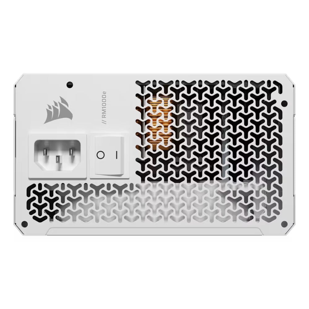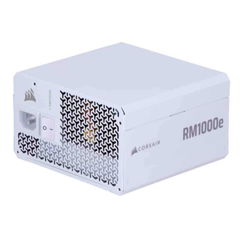 Fuente de poder 1000 W Corsair RM1000E en color blanco, con certificación 80 Plus Gold y diseño full modular. Ideal para PCs gaming o de alto rendimiento que buscan potencia eficiente con estilo.