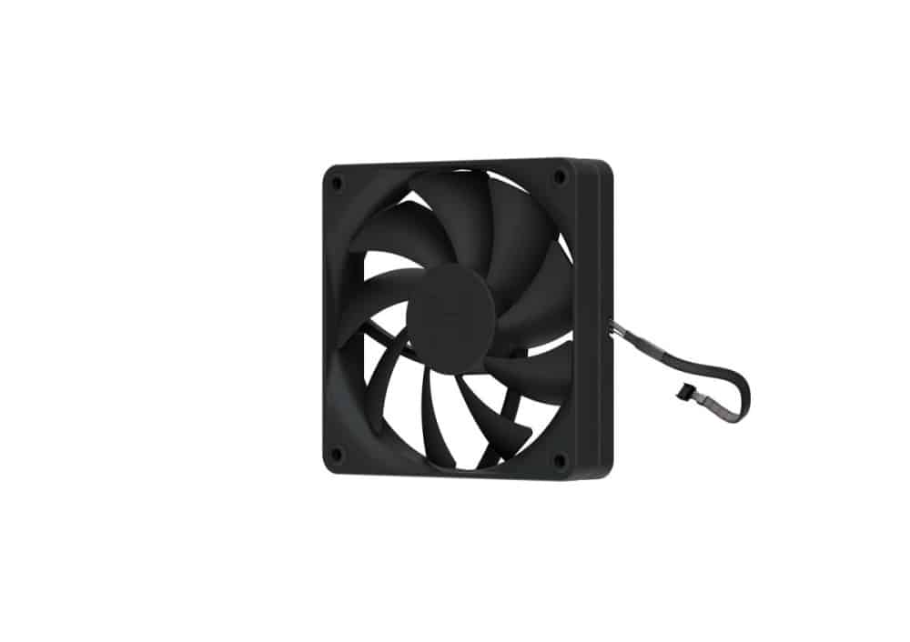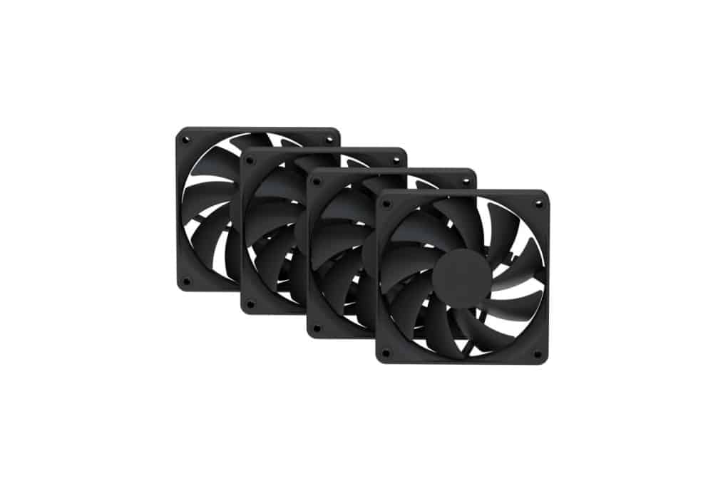 Paquete de 4 ventiladores de 120mm en negro mate, diseñados para un look sobrio y profesional.