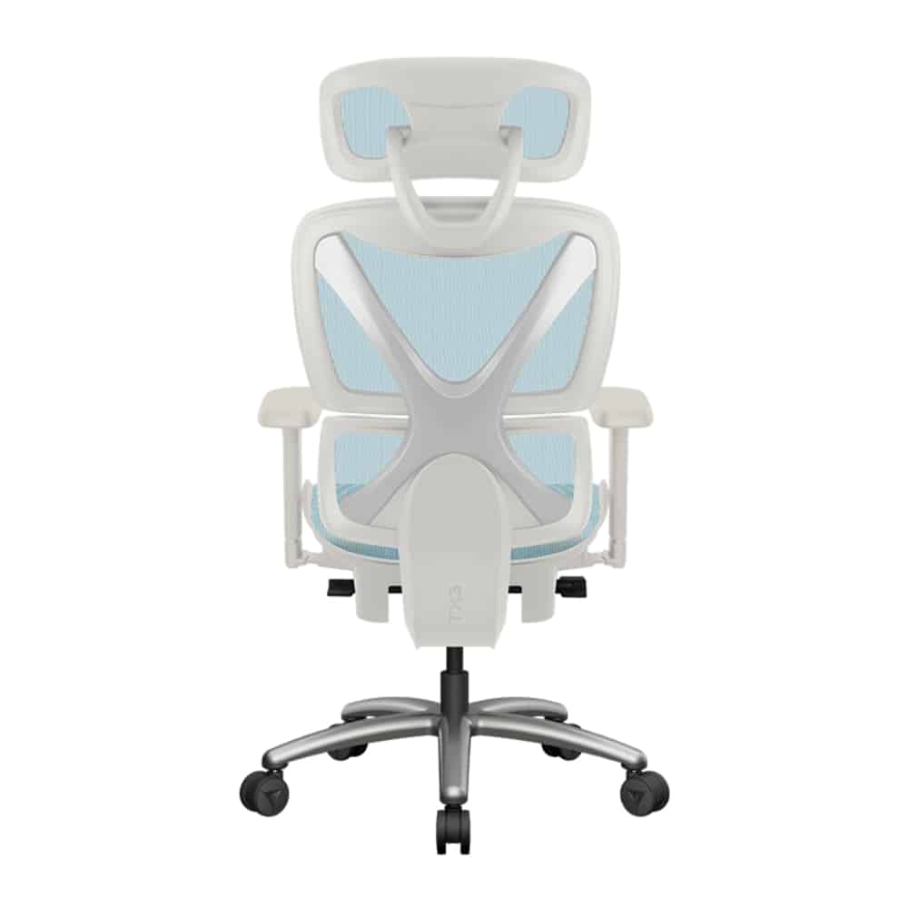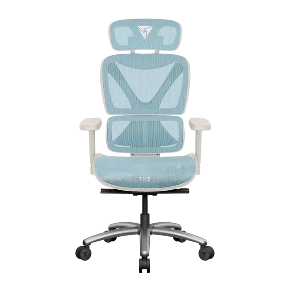 Silla Thunder X3 XTC Chroma en colores blanco y azul con respaldo de malla transpirable y detalles en cuero PU, soporta hasta 150 kg. Ergonomía y estilo para gaming o trabajo.